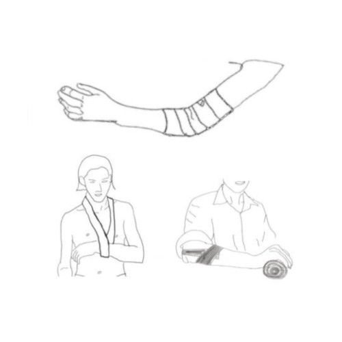 The sling should support the arm through the elbow and forearm, and have the elbow at a right angle to aid the resolution of swelling. When not moving about, remove the sling and support the arm away from the body, in elevation if possible.