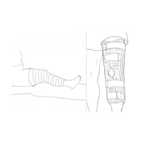 FORCEFUL INJURY: If the injury has happened with force e.g jumping down, forceful twisting, presume a ligament or tendon tear or rupture has occurred. If this is the case OR the patella (knee cap) has been dislocated, wear a Richard Splint (rigid straight knee) over the compression bandage, as in the image. See a doctor as soon as you can for a diagnosis and further advice. When the doctor recommends you can book a physiotherapy consultation as below.