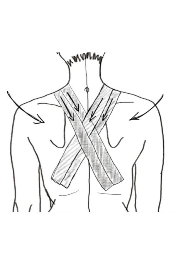 Tape the upper back with the person sitting as tall as they can within pain limits and drawing shoulders back. (Avoid pulling elbows backward). Tape as in the diagram from the neck-shoulder muscle across the upper back to the ribs below the opposite shoulder blade. Use 2 to 3 strips of overlapping tape criss-crossing from each side. See also taping.