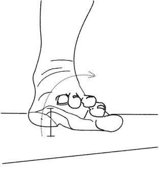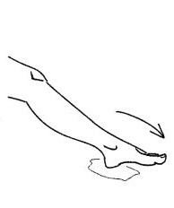 With feet apart and flat on floor, and gently balancing with hands on bench or table, squat until you feel pain.