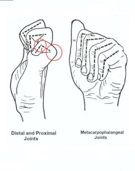Joints: Fingers have 3 joints: Knuckles (MCPs); Middle (Proximal joints PIPs) and; First (Distal joints DIPs). The Thumb joints are called: CMC (Thumb-Wrist joint), MCP (Knuckle), and DIP (First Joint). You will see the movement and ranges of each joint in the diagrams below.
