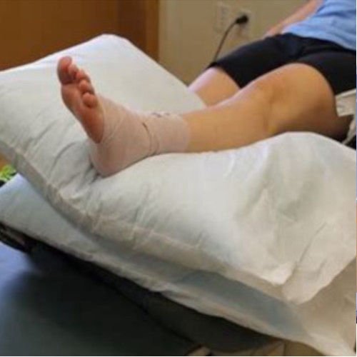 Elevate the injured part above heart level to reduce swelling until you can use the limb. Then elevate whenever you are not using the part e.g when sitting. Upper limbs - elevate on pillow in lying, elevate on pillows on table in sitting. Lower limb - elevate on pillows in lying, on another chair if sitting.