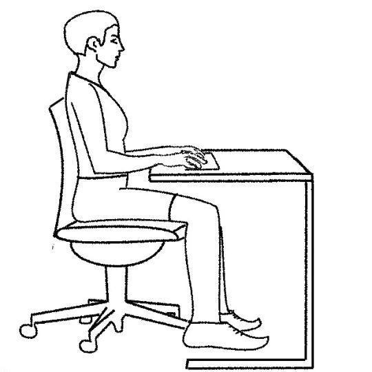 You should be able to sit comfortable with good back support from the chair, adjust the chair height so the hands are able to rest easily on the desk with elbows a little more open than right angles, feet flat on the floor.