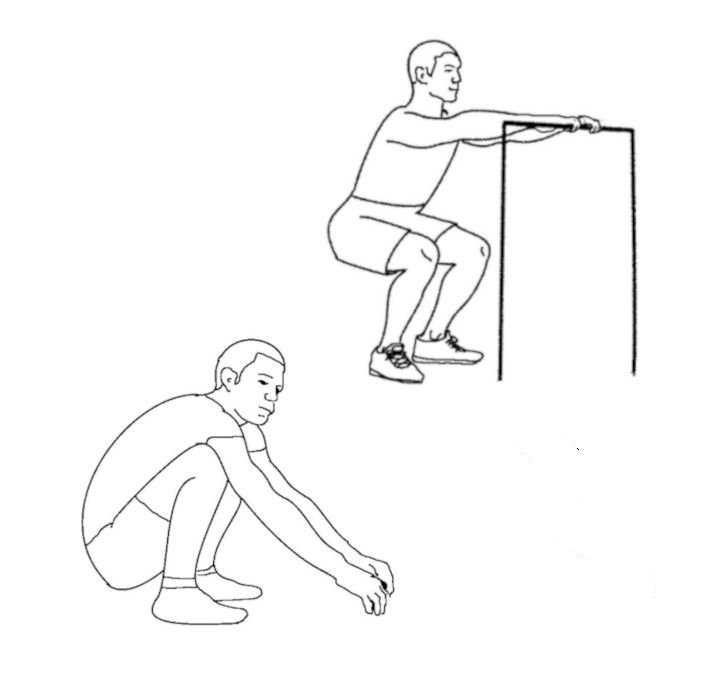 Without creating more that 5/10 pain, continue until you can squat with bottom to heels without resistance or until you have completed the exercise for 2 months.