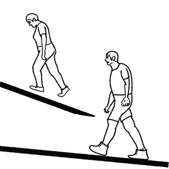 Begin by walking on gentle slopes e.g. 10 degrees. Only walk with mild pain. It is often more difficult to walk downhill than uphill. Begin with a 5 minute walk on the slope period in your walking program.